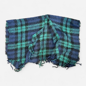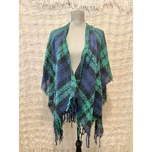 Handmade handknit festival vibe plaid fringe blue green shawl