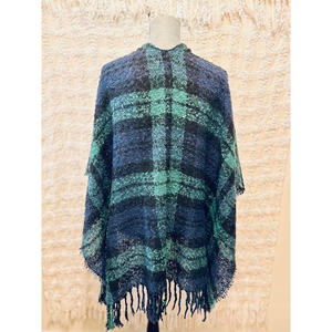 Artisan Handmade knitted plaid poncho shawl fringe green black thick wrap
