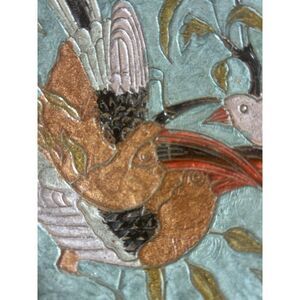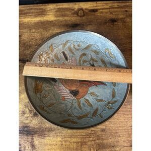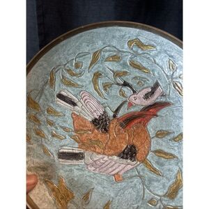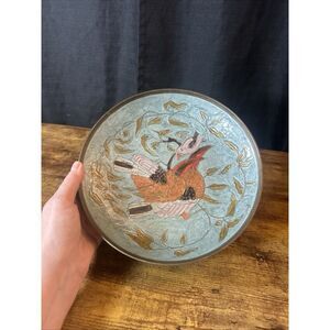 This vintage brass cloisonné centerpiece plate dish bowl features a beautiful birds and vines pattern in a multicolor turquoise design. Made in India, this round bowl has a diameter of 8 3/4" and a height of 2 1/4". The retro style and vintage charm make it a perfect decorative piece for any occasion, adding a touch of elegance to any space with its unique bird theme.