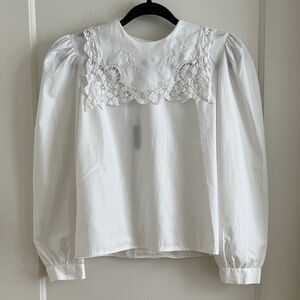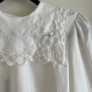 Crisp white 80s vintage top with beautiful lace-trimmed embroidered square collar. Full back button closure. Gathering at shoulder and cuffs for a generous but structured puff sleeve. One button closure cuffs. Made in USA. 65% poly / 35% cotton exclusive of decoration; collar decoration feels like cotton or cotton / linen blend. A gorgeous blouse for a modern, retro, vintage, or historical look! Style with wide leg jeans and a chunky vest for a modern look, or a wool A-line skirt for a vintage or retro look. Or try a long black maxi or full skirt for a historical or history-bounding look! In pristine vintage condition.