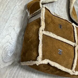 Stylish brown Chanel shearling crossbody bag with silver “Chanel” plate and 4 CC logos on each side.