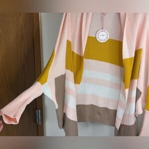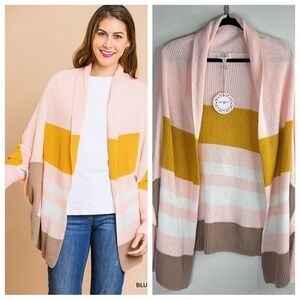 Umgee NWT color block knit open front cardigan. Chic colorblock cardigan with open front. Features pink, yellow, and tan hues. Perfect for layering and casual wear. 100% cotton.