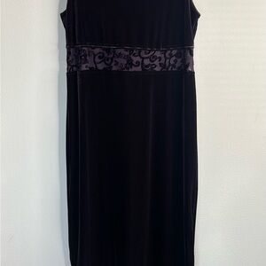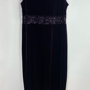 Vintage 90s Dressing Clio dark purple velvet maxi dress with sheer burnout panels at the waist and hem. Womens size S/M. Elegant velvet dress in a rich purple hue. Perfect for special occasions.