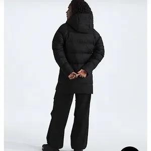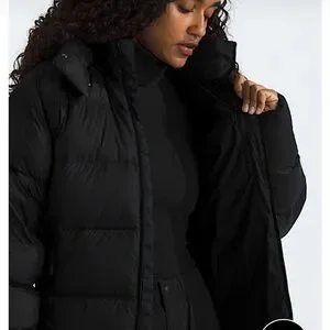 Stay warm and stylish with this sleek black puffer coat. Perfect for chilly days. Flattering fit. Zip on hood. New without tags