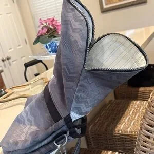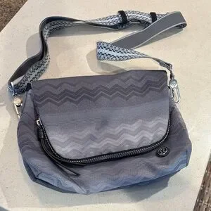 Make an offer! Lightweight, expandable crossbody bag with “guitar” style strap. Grey with silver and black accents. Good condition!