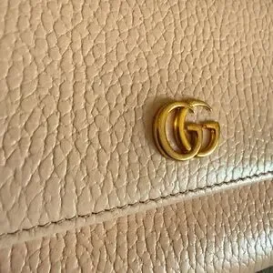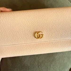Chic pink leather clutch with a gold chain strap. Features iconic Gucci logo. Perfect for elevating any look.