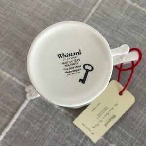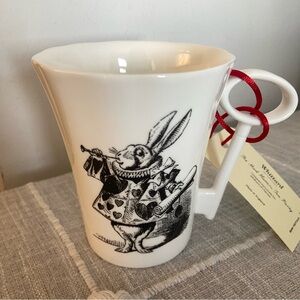 The Whittard of Chelsea Alice in Wonderland Mad Hatter Mug is a collectible, white porcelain mug featuring a detailed, painted design of the character. A key feature is its unique handle, shaped like a key, referencing the key Alice finds to open the door to the garden in the tale.
