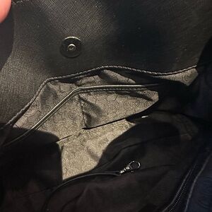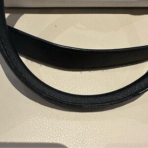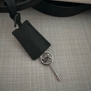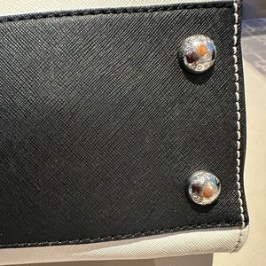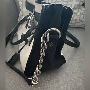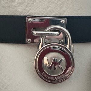 Michael Kors chic and versatile Hamilton bag. This black and white handbag with silver chain and lock detail is perfect for any occasion. Its sleek design and high-quality materials make it a must-have accessory. Two side pockets inside as well as zipper pocket inside. Excellent condition. Top handles and shoulder strap. Size 12” x 9.5”, shoulder strap 30”. Some slight wear on the handles (see photos). Finish on feet shows some wear (see photos).