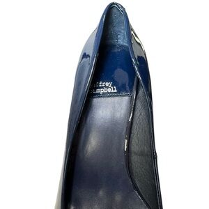 Add a touch of high-gloss sophistication to your ensemble with these sleek Jeffrey Campbell pumps. Crafted in a deep, classic navy blue patent leather, these heels feature a sharp pointed-toe silhouette and a commanding stiletto heel. A versatile choice for everything from office wear to formal evening events.
