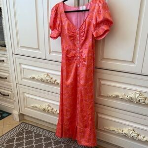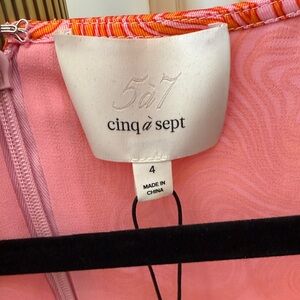 Chic CINQ A SEPT midi dress with button-down front. There are 14 buttons going down the front of the dress. The back of the dress has a zipper closure. Features puff sleeves and a flattering fit. It is a size 4. It is new and never worn.