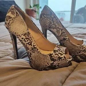 Step out in style with these chic snakeskin patterned peep toe heels. Perfect for any occasion, these shoes add a touch of elegance to your outfit.