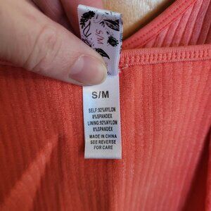 Wishlist ribbed tank top with built in bra (with cups). I love this color for the summer, but this is too small on me. The inside seam is starting to come undone in one area, but it should be a quick fix with some string or fabric glue.