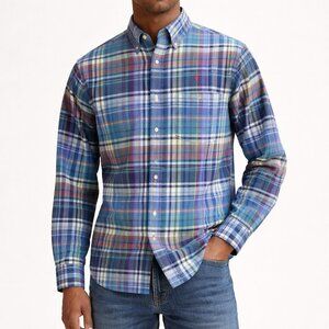 Crisp, unworn Polo Ralph Lauren woven shirt in a vibrant multicolor plaid that blends blues, greens, teal, yellow, red, and white for a classic yet eye-catching preppy look. Made from breathable 100% cotton with a smooth, lightweight hand feel that works year-round. This is the kind of timeless Polo piece that layers effortlessly over a tee or under a sweater and pairs perfectly with denim or chinos.