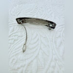 Southwestern silver hair barrette with intricate designs and a turquoise stone. 3”. This is a smaller hair clip, and if you have a very thick ponytail, it will not hold your entire ponytail. Better for pulling a piece of hair back from your face on the top of your head or perhaps use on the side.