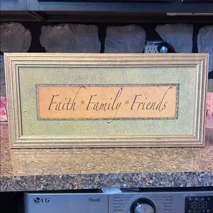 Enhance your home with this elegant gold and green framed wall art featuring the words 'Faith Family Friends'. Perfect for adding a touch of warmth and inspiration to any room. The wall art has a textured feel to it. I bought it from Kirklands.