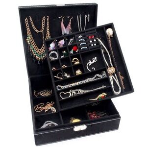 Keep your jewelry neatly organized with this elegant black suede jewelry organizer box.
