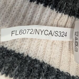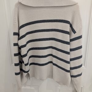 Free Assembly half zip sweater size small chunky knit design with black stripes collared neckline long sleeves. The sweater is of medium weight made of polyester and recycled polyester, machine washable.