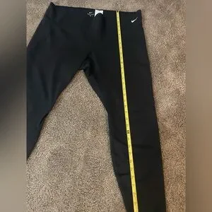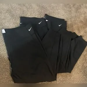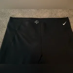 Women’s plus sleek black Nike leggings with bold white Nike swoosh at hip. Ideal for any workout to everyday wear. Comfy and soft high waisted black leggings.