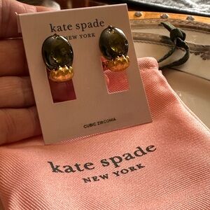 New and Authentic Kate Spade Stud Earrings. A unique oversized cubic zirconia glass stone in a deep green peridot color. The stone rests in the paw of a cat. Super adorable.