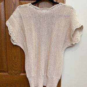 Beige open knit cardigan with short dolman style sleeves. Cute knit detail around neckline and sleeves. Perfect layer for spring and summer. No visible flaws, great used condition. PTP: 20”, length: 25”