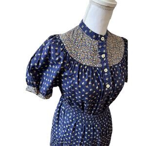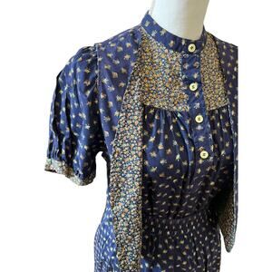 Amazing Vintage 70’s floral 3 piece prairie skirt set from The Art Shirt by Cracker. Vintage size 11-12 but fits like a modern day S. Fantastic vintage condition. Full skirt with elastic waistband in a navy floral pattern. Coordinating short sleeve shirt and reversible vest