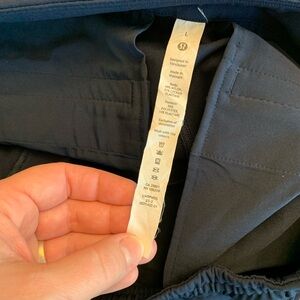 Sweat-wicking. Four-way stretch. Faux fly. Feels cool to the touch. Added Lycra fibre for stretch and shape retention. Front pockets with interior card sleeve. Back welt pockets are stitched closed—snip the stitches to make the pockets functional. Waistband drawcord can be worn inside or out. Lululemon 7/8 inseam length. Smoke-free home.