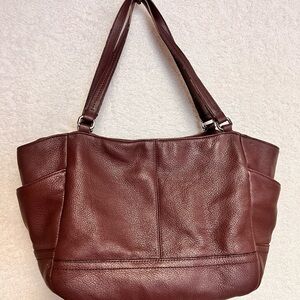 Sophisticated Coach shoulder bag in rich mahogany leather. Features a spacious interior and elegant design.
