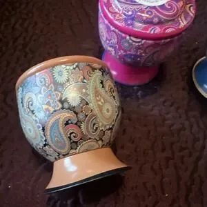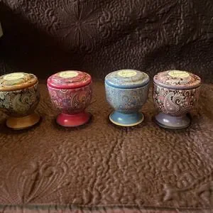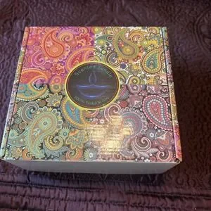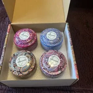 Cute gift box with 4 individual scented candles in cute decorative tins. The scent is citronella. Perfect to keep mosquitoes and other insects away. 💯% natural soy. Received as a gift and I just don't spend a lot of time outside. Now I'm moving and it's got to go.