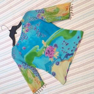 Brightly decorated woman's shirt by forbidden featuring a vibrant mix of colors. Perfect for adding a splash of fun to any outfit. Size M