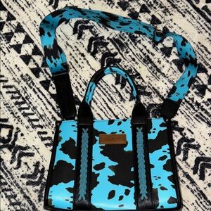 Bold crossbody bag with a unique black and blue pattern. Features sturdy handles and adjustable strap. Ideal for everyday use.