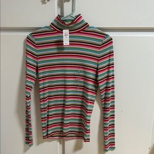Brighten your wardrobe with this colorful striped turtleneck. Ideal for casual outings. Pit to pit 16 in.