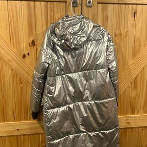 Stay warm and stylish with this metallic silver puffer coat. Perfect for chilly days, it combines fashion and function effortlessly.