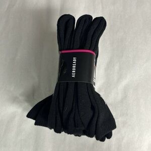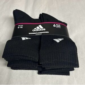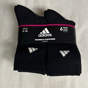 Stay comfortable with Adidas cushioned crew socks. Ideal for athletic use. Durable and stylish. This is a brand new with tags package of 6 pairs of women’s black cushioned aeroready crew socks that fit shoe size 5-10. These socks come from my pet free, non smoking home.