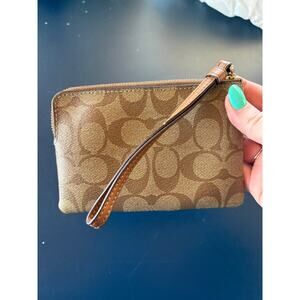 Coach Corner Zip Wristlet in Signature Logo Khaki with Brown Leather Stripe