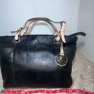 Michael kors Elegant black leather tote bag with beige handles. Perfect for everyday use.
