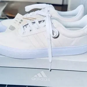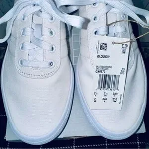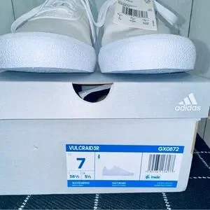 Crisp white Adidas sneakers. Comfortable and versatile. Ideal for everyday wear. About this item: These shoes are listed as, Women's Vulc Raid3r Skateboarding Shoes, and appear to be sold out at most popular stores.
