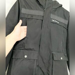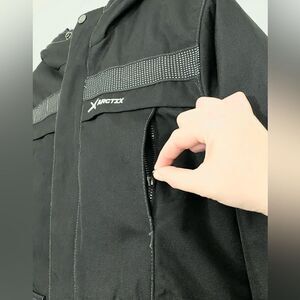 Black Arctix tundra insulated winter coat. Reflective stripes on the chest. One inside velcro pocket, 2 chest hidden zippered pockets, 2 front snap pockets. Zipper and snap front closure. Hood. Quilted inner lining. Ripped wrist cuffs. Two tiny white marks shown in pictures with a red circle. Smoke free home. Durable. Warm. Great condition.
