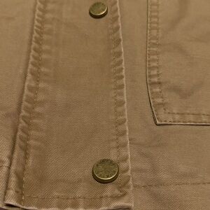 Classic Hunter insulated 100% cotton jacket in tan with a dark brown collar. Includes front pockets and button closure.
