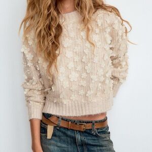 Chic sweater with floral accents. Soft and stylish tulle overlay with flowers to add delicate texture.