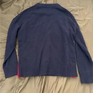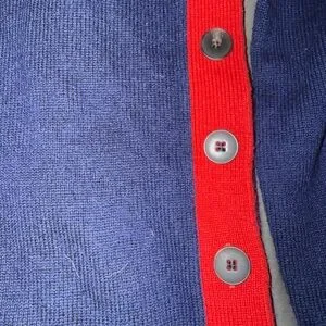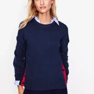 Zia button side jumper sweater. Elegant navy sweater with striking red side panels. Ideal for versatile styling.
