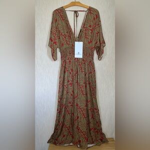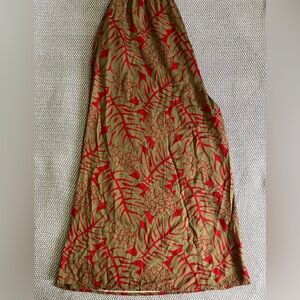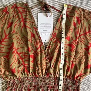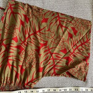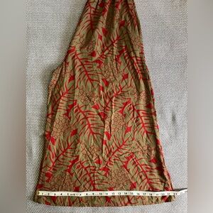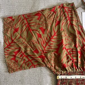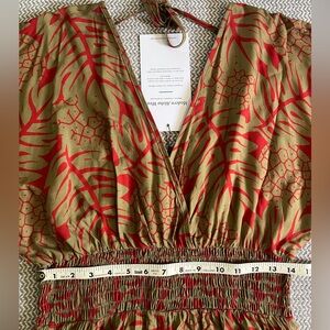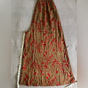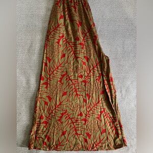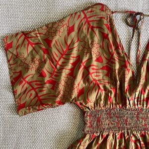 Gorgeous gold and red v-neck jumpsuit with shirred waist.