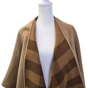 Authentic Burberry Charlotte reversible Merino wool check cape poncho, 140cm x 140cm. Features signature Burberry check on one side and solid camel tan on the reverse. Shawl collar, open front, and elegant handkerchief hem.