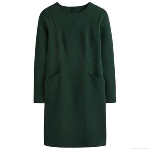 Elegant and versatile Boden Ellen Ottoman dress in a rich pine green textured ottoman knit. This flattering shift silhouette features long sleeves, subtle seam detailing, and functional front pockets for everyday ease. Perfect for work, travel, or elevated casual styling.