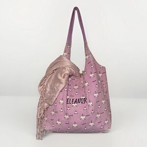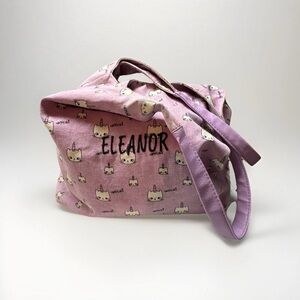 Charming pink medium canvas tote bag decorated with a cute cat print and “Eleanor” embroidery. Designed with faux leather handles, snap button closure, and lined interior with one zip pocket. Fun and practical, great for everyday wear, school, or as a gift.