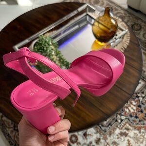Chic fuchsia platform heels. Strappy design with bold lift.