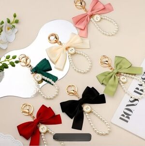 Add a touch of elegance to your accessories with this set of bow and pearl keychains.