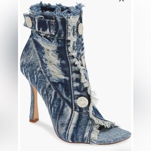 Step out in style with these frayed denim peep-toe heels. The blue denim adds a trendy flair to any ensemble, making them perfect for both casual and dressy occasions.
