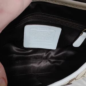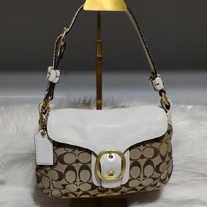 Beautiful authentic Collectible Stylish Coach Bleeker Signature Canvas & Leather flap shoulder bag with signature pattern. Features tan and white design. A gold buckle accent adds elegance. Does have it's original hangtag! Vintage 2000's!