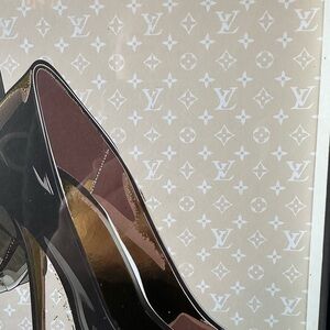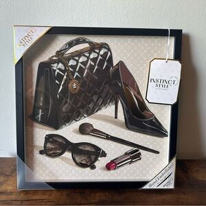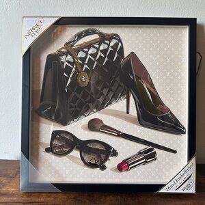 Chic luxury designer wall decor featuring black double C handbag with sleek high heels. Includes stylish sunglasses and bold red lipstick. Cream colored background with LV’s. Black frame and durable plexiglass. Brand new with tags.