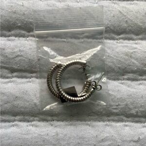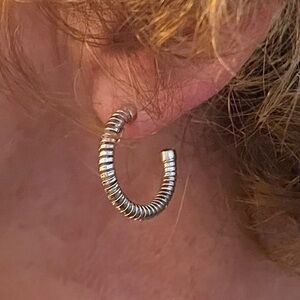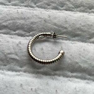 From the Cable Collection—David Yurman’s artistic signature. Cable began as a bracelet that he hand-twisted from 50 feet of wire. Over the last 30 years, he has evolved from the twisted helix into a myriad of designs and types of jewelry. Sterling silver. About the size of a dime (see photo for reference). Post back (only one has the original earring back—the other has a basic sterling back, though they appear the same.